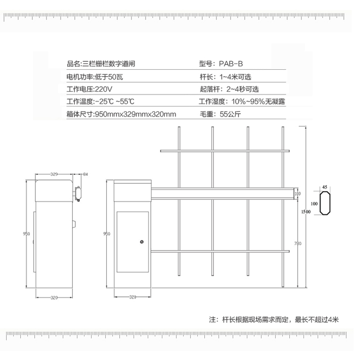 三欄柵欄數(shù)字道閘-B型,外觀結(jié)構(gòu)由三欄柵欄和道閘箱體組成,美觀實(shí)用。三欄道閘采用100W的一體化減速力矩電機(jī),堵轉(zhuǎn)時(shí)無(wú)電流沖擊,無(wú)過(guò)熱,保護(hù)延長(zhǎng)控制器的使用壽命。由于是三欄柵欄的原因,其升降速度需要緩慢一些;加上三欄道閘最大優(yōu)勢(shì),可以防止人員從柵欄底下進(jìn)出和柵欄上方跨進(jìn)跨出過(guò)功率大主要安裝在各車輛進(jìn)出收費(fèi)口;因此該道閘非常適合一些較為高檔、隱蔽性需求性強(qiáng)的停車管理場(chǎng)合。