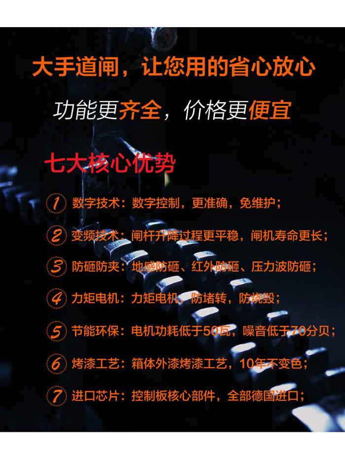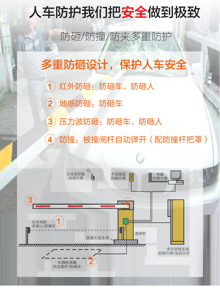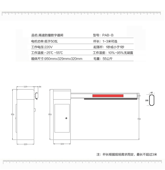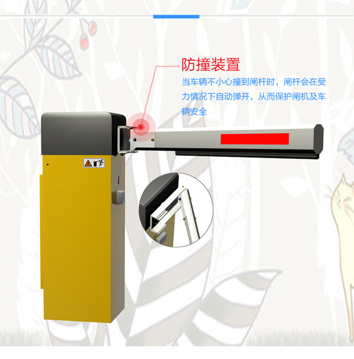 高速直桿防撞數(shù)字道閘-B型,在國內(nèi)停車道閘系統(tǒng)中最先進(jìn)智能的一款道閘系統(tǒng)。該款道閘最吸引客戶的優(yōu)勢就是:防撞。系統(tǒng)原理:防撞道閘是在直桿道閘設(shè)備的基礎(chǔ)上進(jìn)行全面開發(fā)升級,在閘桿與機(jī)箱的結(jié)合處增設(shè)防撞桿把罩,當(dāng)閘桿出現(xiàn)沖撞時,防撞桿把罩能起到一定的緩沖作用,保護(hù)箱體和閘桿不易被撞壞。系統(tǒng)優(yōu)勢:配備高端、質(zhì)量上乘的電機(jī),升降速度最短可為1秒,機(jī)體外殼采用鋼板進(jìn)行保護(hù),保障了高速直桿防撞數(shù)字道閘-B型的耐用程度,是高速公路的停車管理系統(tǒng)的配套首選。