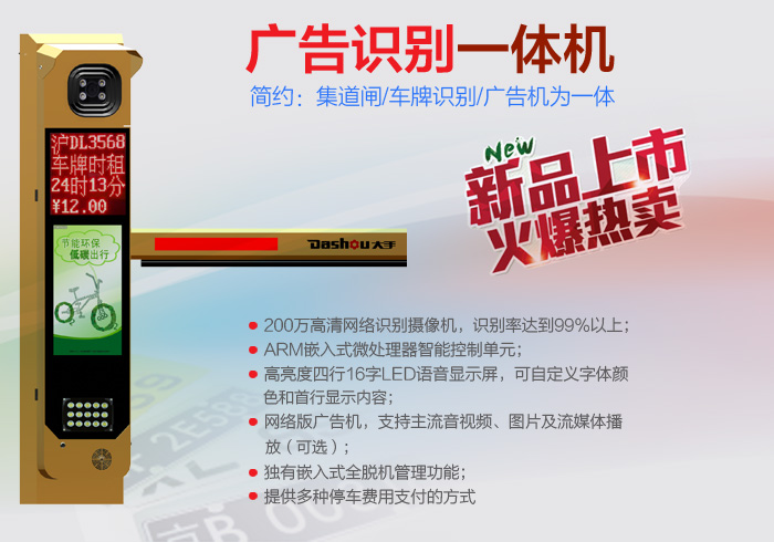 旗艦版廣告機(jī)型車牌識(shí)別收費(fèi)管理系統(tǒng),是大手控制目前最為高端的車牌識(shí)別收費(fèi)管理系統(tǒng),可實(shí)現(xiàn)時(shí)租收費(fèi)與月租管理,免取卡票不停車進(jìn)出停車場(chǎng)。系統(tǒng)以超高穩(wěn)定性取勝,采用全嵌入式系統(tǒng)構(gòu)架,可以免電腦全脫機(jī)工作。云端信息化上網(wǎng)功能,簡(jiǎn)單聯(lián)網(wǎng)就能實(shí)現(xiàn)移動(dòng)辦公和集團(tuán)管理,第三方信息化接口,可以將停車業(yè)務(wù)接入到第三方信息平臺(tái)和手機(jī)App系統(tǒng)里,輕松實(shí)現(xiàn)互通互聯(lián),適合用于鋪建城市停車信息化平臺(tái)和搭建各類以停車為基礎(chǔ)的互聯(lián)網(wǎng)電商平臺(tái)。可根據(jù)收費(fèi)需求,任意拓展出票或出卡停車收費(fèi)系統(tǒng)。